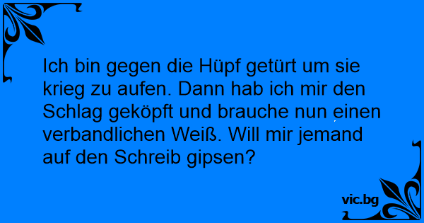 Ich bin gegen die Hüpf getürt um sie krieg zu aufen. Dann hab ich mir den Schlag geköpft und brauche nun einen verbandlichen Weiß. Will mir jemand auf den Schreib gipsen?