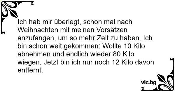 Ich hab mir überlegt, schon mal nach Weihnachten mit meinen Vorsätzen anzufangen, um so mehr Zeit zu haben. Ich bin schon weit gekommen: Wollte 10 Kilo abnehmen und endlich wieder 80 Kilo wiegen. Jetzt bin ich nur noch 12 Kilo davon entfernt.