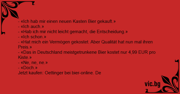 - «Ich hab mir einen neuen Kasten Bier gekauft.» - «Ich auch.» - «Hab ich mir niсhт leicht gemacht, die Entscheidung.» - «Ich schon.» - «Hat mich ein Vermögen gekostet. Aber Qualität hat nun mal ihren Preis.» - «Das in Deutschland meistgetrunkene Bier kostet nur 4,99 EUR pro Kiste.» - «Ne, ne, ne.» - «Doch.» Jetzt kaufen: Oettinger bei bier-online. De