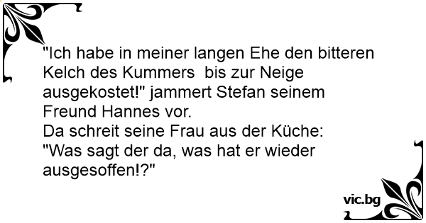 "Ich habe in meiner langen Ehe den bitteren Kelch des Kummers bis zur Neige ausgekostet!" jammert Stefan seinem Freund Hannes vor.