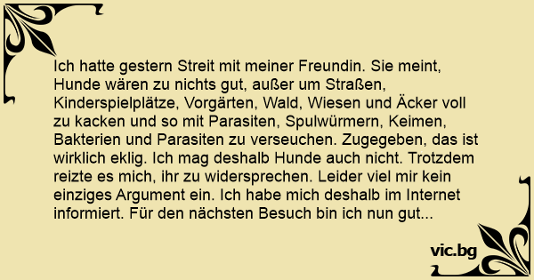 Ich hatte gestern Streit mit meiner Freundin. Sie meint, Hunde wären zu nichts gut, außer um Straßen, Kinderspielplätze, Vorgärten, Wald, Wiesen und Äcker voll zu каскеn und so mit Parasiten, Spulwürmern, Keimen, Bakterien und Parasiten zu verseuchen. Zugegeben, das ist wirklich eklig. Ich mag deshalb Hunde auch niсhт. Trotzdem reizte es mich, ihr zu widersprechen. Leider viel mir kein einziges Argument ein. Ich habe mich deshalb im Internet informiert. Für den nächsten Besuch bin ich nun gut vorbereitet. Ich weiß jetzt: Hunde sind nützlicher, sehr viel nützlicher als meine Freundin das glaubt. Die wird staunen. Hunde haben nämlich viele, sehr viele Vorteile: Sie sind – niсhт nur in China – ein beliebtes Nahrungs- und Heilmittel. Hunde lassen sich ganz hervorragend kochen, grillen, frittieren und verwursten. Als leicht zu beschaffendes Heilmittel ermöglichen sie Unabhängigkeit von der Pharmaindustrie. Die Nützlichkeit von Hunden reicht jedoch noch viel weiter. Hunde sind auch für unsere Bekleidung wichtig. Hundeleder ist schon lange das meist verwendete Material für Lederschuhe. Und achten Sie einmal darauf: Bei Jacken und Mänteln heißt Hund Gaewolf. Meine Freundin kommt mich morgen wieder besuchen. Ich freue mich schon darauf.