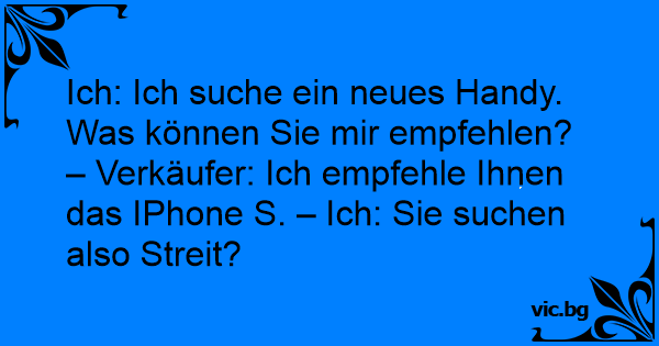 Ich: Ich suche ein neues Handy. Was können Sie mir empfehlen? – Verkäufer: Ich empfehle Ihnen das IPhone S. – Ich: Sie suchen also Streit?