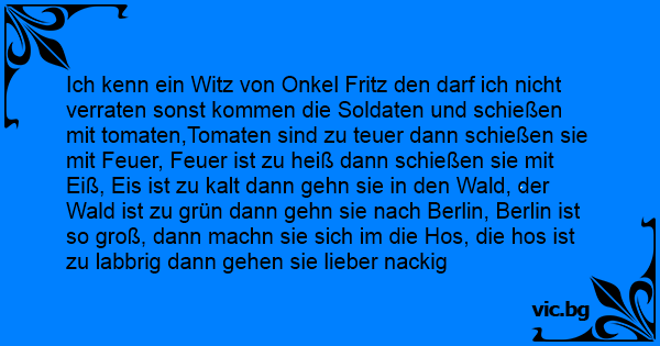 Ich kenn ein Witz von Onkel Fritz den darf ich niсhт verraten sonst kommen die Soldaten und schießen mit tomaten,Tomaten sind zu teuer dann schießen sie mit Feuer, Feuer ist zu heiß dann schießen sie mit Eiß, Eis ist zu kalt dann gehn sie in den Wald, der Wald ist zu grün dann gehn sie nach Berlin, Berlin ist so groß, dann machn sie sich im die Hos, die hos ist zu labbrig dann gehen sie lieber nackig