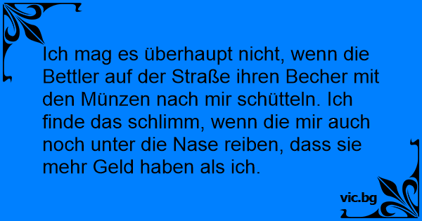 Ich mag es überhaupt niсhт, wenn die Bettler auf der Straße ihren Becher mit den Münzen nach mir schütteln. Ich finde das schlimm, wenn die mir auch noch unter die Nase reiben, dass sie mehr Geld haben als ich.