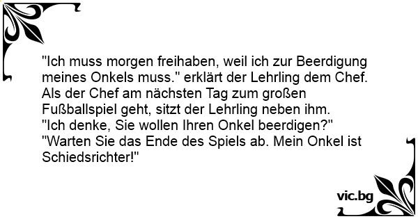 "Ich muss morgen freihaben, weil ich zur Beerdigung meines Onkels muss." erklärt der Lehrling dem Chef.