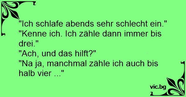 Ein Mann bestellt nun schon den 10. Kaffee. Fragt der Kellner: "Haben sie eigentlich nie Probleme mit dem Einschlafen, wenn sie soviel Kaffee trinken?" Mann: "Ach, mit dem Einschlafen ist das immer so: Ich zähle bis drei, und dann schlaf ich meistens." Kellner: "Sie zählen bis drei?" Mann: "Naja...