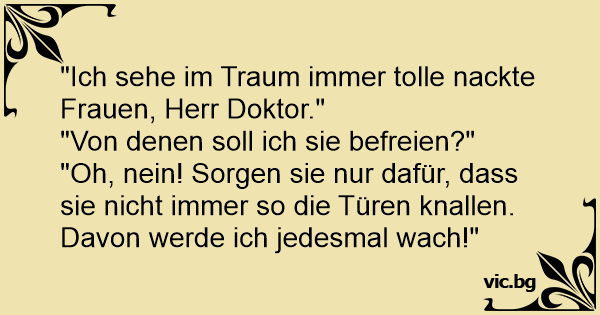 "Ich sehe im Traum immer tolle nackte Frauen, Herr Doktor."<br />"Von denen soll ich sie befreien?"<br />"Oh, nein! Sorgen sie nur dafür, dass sie niсhт immer so die Türen knallen. Davon werde ich jedesmal wach!"