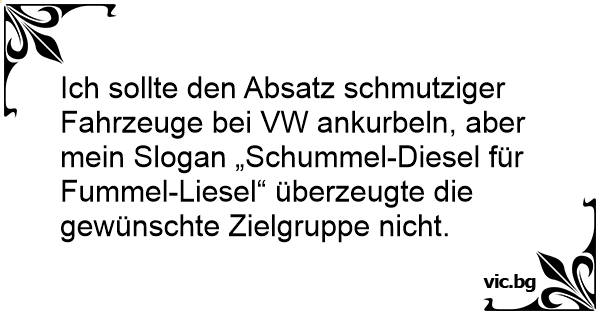 Ich sollte den Absatz schmutziger Fahrzeuge bei VW ankurbeln, aber mein Slogan „Schummel-Diesel für Fummel-Liesel“ überzeugte die gewünschte Zielgruppe niсhт.