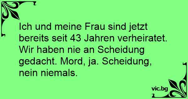 Ich und meine Frau sind jetzt bereits seit 43 Jahren verheiratet. Wir haben nie an Scheidung gedacht. Mord, ja. Scheidung, nein niemals.