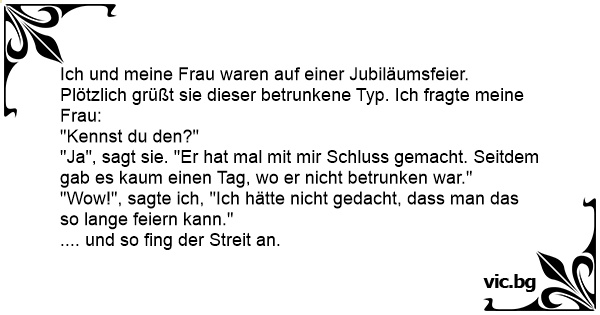 Ich und meine Frau waren auf einer Jubiläumsfeier. Plötzlich grüßt sie dieser betrunkene Typ. Ich fragte meine Frau: