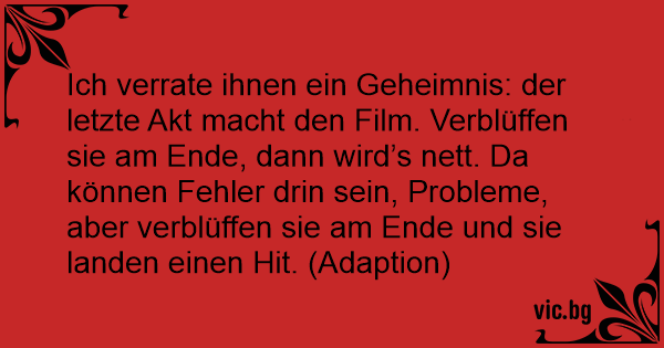 Ich verrate ihnen ein Geheimnis: der letzte Akt macht den Film. Verblüffen sie am Ende, dann wird’s nett. Da können Fehler drin sein, Probleme, aber verblüffen sie am Ende und sie landen einen Hit. (Adaption)