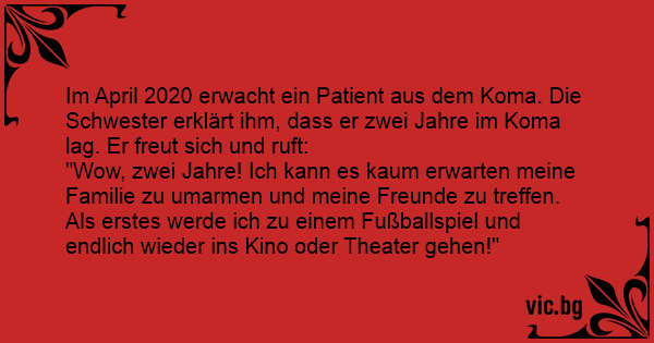 Im April 2020 erwacht ein Patient aus dem Koma. Die Schwester erklärt ihm, dass er zwei Jahre im Koma lag. Er freut sich und ruft: