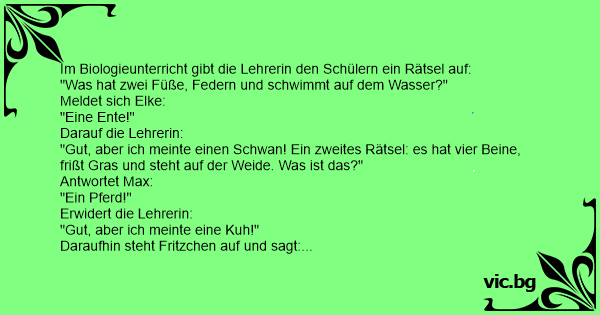 Tanárnő az órán felteszi a kérdést: Mi az: Zöld és ugrál? - Pistike jelentkezik. - Igen Pistike mondd! - Béka! - Helyes, de lehetne szöcske is. - Következő: Barna és 4 lába van? Mondd Pistike! -...