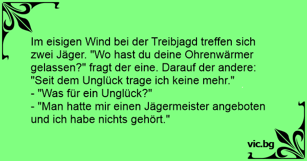 Im eisigen Wind bei der Treibjagd treffen sich zwei Jäger. "Wo hast du deine Ohrenwärmer gelassen?" fragt der eine. Darauf der andere:
