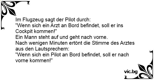 В самолет, по високоговорителя се чува гласа на стюардесата: - Уважаеми пътници, моля, ако сред вас има лекар, да се яви в пилотската кабина. Някакъв мъж става и се насочва към пилотската кабина. След две минути отново се чува гласа на стюардесата: - Уважаеми пътници, моля, ако сред вас има...