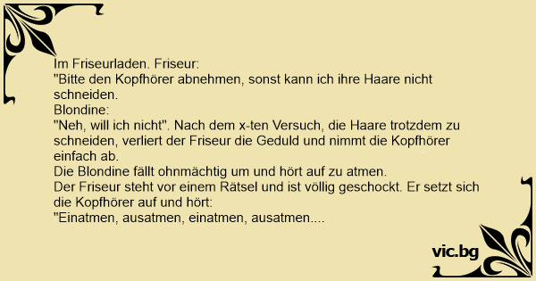 Eine Blondine kommt zum Friseur. Dieser sagt ihr, sie müsse zum Haare schneiden den Walkman abnehmen. Nach kurzem Zögern tut sie das. Auf einmal merkt der Friseur, dass sie gestorben ist. Er führt...
