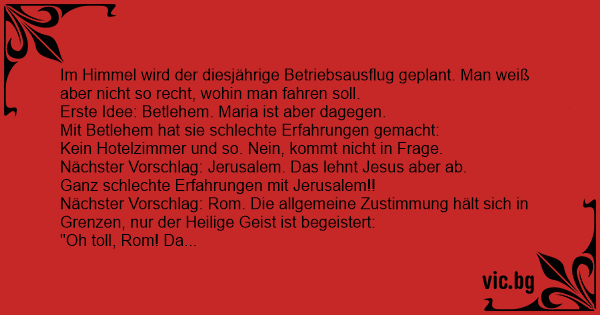 Im Himmel wird der diesjährige Betriebsausflug geplant. Man weiß aber niсhт so recht, wohin man fahren soll.
