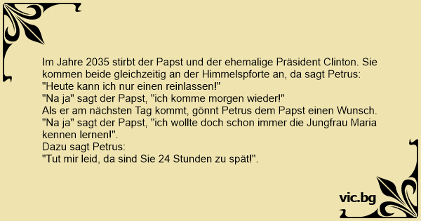 Im Jahre 2035 stirbt der Papst und der ehemalige Präsident Clinton. Sie kommen beide gleichzeitig an der Himmelspforte an, da sagt Petrus: