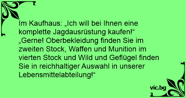 „Gerne! Oberbekleidung finden Sie im zweiten Stock, Waffen und Munition im vierten Stock und Wild und Geflügel finden Sie in reichhaltiger Auswahl in unserer Lebensmittelabteilung!“