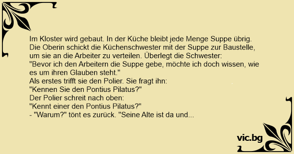 Im Kloster wird gebaut. In der Küche bleibt jede Menge Suppe übrig. Die Oberin schickt die Küchenschwester mit der Suppe zur Baustelle, um sie an die Arbeiter zu verteilen. Überlegt die Schwester: "Bevor ich den Arbeitern die Suppe gebe, möchte ich doch wissen, wie es um ihren Glauben steht." Als erstes trifft sie den Polier. Sie fragt ihn: "Kennen Sie den Pontius Pilatus?" Der Polier schreit nach oben: "Kennt einer den Pontius Pilatus?" - "Warum?" tönt es zurück. "Seine Alte ist da und bringt ihm das Essen!"