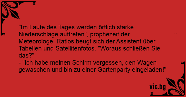 - "Ich habe meinen Schirm vergessen, den Wagen gewaschen und bin zu einer Gartenparty eingeladen!"