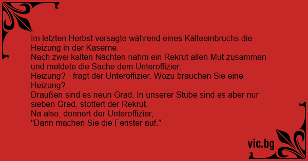 Nach zwei kalten Nächten nahm ein Rekrut allen Mut zusammen und meldete die Sache dem Unteroffizier.