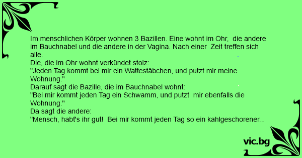 Im menschlichen Körper wohnen 3 Bazillen. Eine wohnt im Ohr, die andere im Bauchnabel und die andere in der Vаginа. Nach einer Zeit treffen sich alle.
