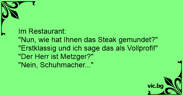 "Wie war das Steak?" - "Erstklassig. Und ich sage das als Profi." - "Sie sind Schlachter?" - "Nein, Schuhmacher!"