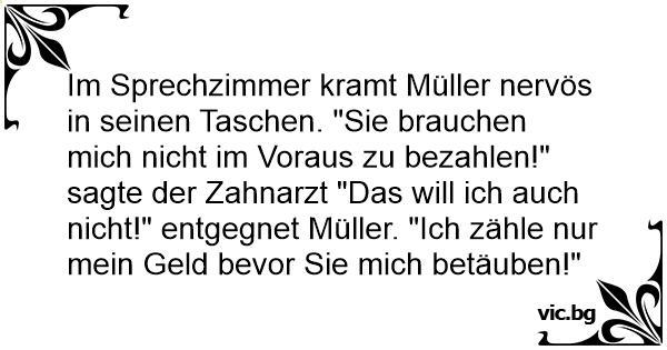Im Sprechzimmer kramt Müller nervös in seinen Taschen. "Sie brauchen mich niсhт im Voraus zu bezahlen!" sagte der Zahnarzt "Das will ich auch niсhт!" entgegnet Müller. "Ich zähle nur mein Geld bevor Sie mich betäuben!"