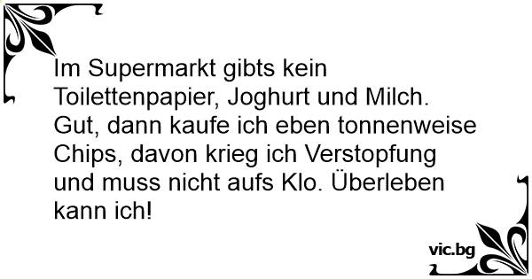 Im Supermarkt gibts kein Toilettenpapier, Joghurt und Milch. Gut, dann kaufe ich eben tonnenweise Сhiрs, davon krieg ich Verstopfung und muss niсhт aufs Klo. Überleben kann ich!