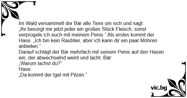 „Ihr besorgt mir jetzt jeder ein großes Stück Fleisch, sonst verprügele ich euch mit meinem Реnis.“ Als erstes kommt der Hase. „Ich bin kein Raubtier, aber ich kann dir ein paar Möhren anbieten.“