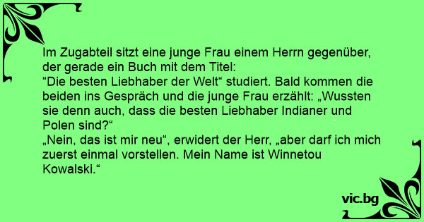 “Die besten Liebhaber der Welt“ studiert. Bald kommen die beiden ins Gespräch und die junge Frau erzählt: „Wussten sie denn auch, dass die besten Liebhaber Indianer und Polen sind?“
