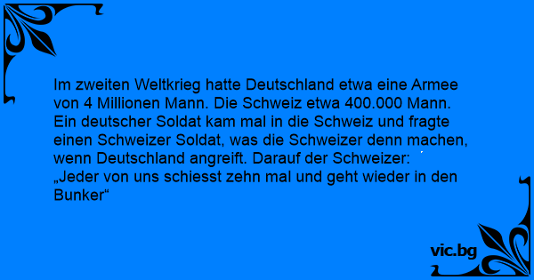 Ein deutscher Soldat kam mal in die Schweiz und fragte einen Schweizer Soldat, was die Schweizer denn machen, wenn Deutschland angreift. Darauf der Schweizer: