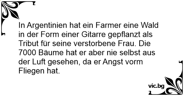 In Argentinien hat ein Farmer eine Wald in der Form einer Gitarre gepflanzt als Tribut für seine verstorbene Frau. Die 7000 Bäume hat er aber nie selbst aus der Luft gesehen, da er Angst vorm Fliegen hat.