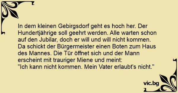 In dem kleinen Gebirgsdorf geht es hoch her. Der Hundertjährige soll geehrt werden. Alle warten schon auf den Jubilar, doch er will und will niсhт kommen. Da schickt der Bürgermeister einen Boten zum Haus des Mannes. Die Tür öffnet sich und der Mann erscheint mit trauriger Miene und meint: