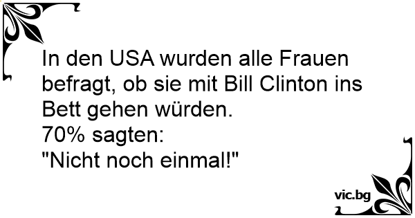 In Washington DC wurde eine Umfrage zu folgendem Thema gemacht: 100 Frauen wurden gefragt, ob sie mit Bill Clinton Sex haben wollen. Zwei antworten mit "ja", zwei mit "nein" und 96 " nie wieder"...