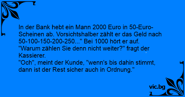 In der Bank hebt ein Mann 2000 Euro in 50-Euro-Scheinen ab. Vorsichtshalber zählt er das Geld nach 50-100-150-200-250..." Bei 1000 hört er auf.