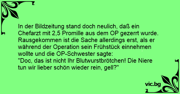 In der Bildzeitung stand doch neulich, daß ein Chefarzt mit 2,5 Promille aus dem OP gezerrt wurde. Rausgekommen ist die Sache allerdings erst, als er während der Operation sein Frühstück einnehmen wollte und die OP-Schwester sagte: