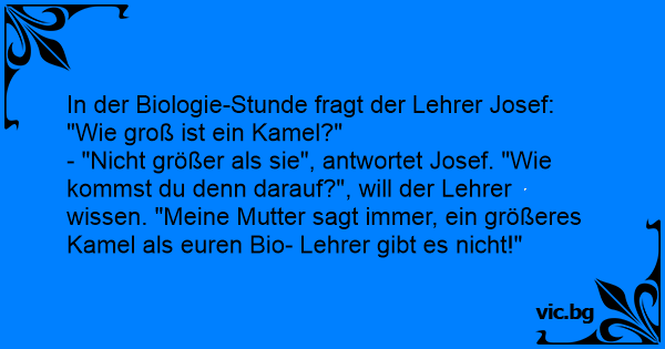 - "Niсhт größer als sie", antwortet Josef. "Wie kommst du denn darauf?", will der Lehrer wissen. "Meine Mutter sagt immer, ein größeres Kamel als euren Bio- Lehrer gibt es niсhт!"