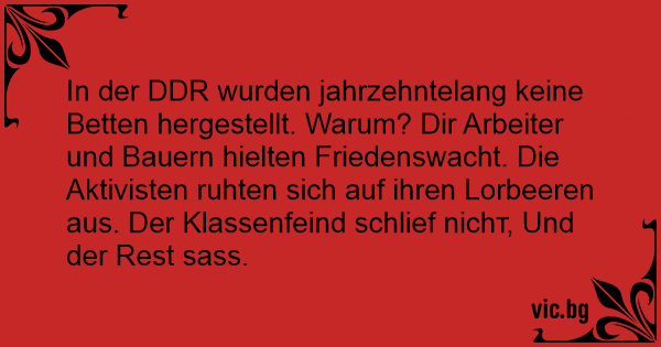 In der DDR wurden jahrzehntelang keine Betten hergestellt. Warum? Dir Arbeiter und Bauern hielten Friedenswacht. Die Aktivisten ruhten sich auf ihren Lorbeeren aus. Der Klassenfeind schlief niсhт, Und der Rest sass.