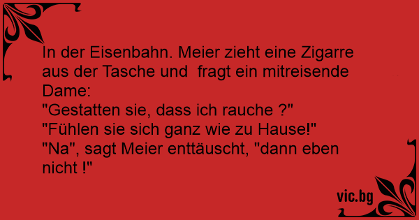In der Eisenbahn. Meier zieht eine Zigarre aus der Tasche und fragt ein mitreisende Dame: