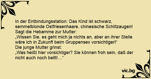 In der Entbindungsstation: Das Kind ist schwarz, semmelblonde Ostfriesenhaare, chinesische Schlitzaugen! Sagt die Hebamme zur Mutter: