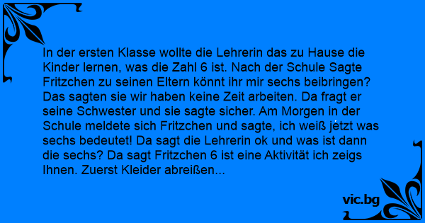 In der ersten Klasse wollte die Lehrerin das zu Hause die Kinder lernen, was die Zahl 6 ist. Nach der Schule Sagte Fritzchen zu seinen Eltern könnt ihr mir sechs beibringen? Das sagten sie wir haben keine Zeit arbeiten. Da fragt er seine Schwester und sie sagte sicher. Am Morgen in der Schule meldete sich Fritzchen und sagte, ich weiß jetzt was sechs bedeutet! Da sagt die Lehrerin ok und was ist dann die sechs? Da sagt Fritzchen 6 ist eine Aktivität ich zeigs Ihnen. Zuerst Kleider abreißen auf das Bett schmeißen sich auf sie drauf legen und los вuмsеn. ~ 1 2 3 los