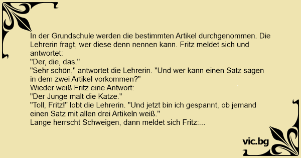 In der Grundschule werden die bestimmten Artikel durchgenommen. Die Lehrerin fragt, wer diese denn nennen kann. Fritz meldet sich und antwortet: