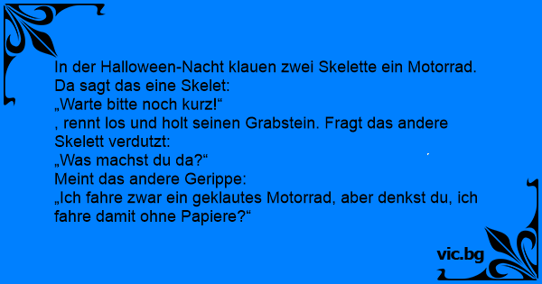 In der Halloween-Nacht klauen zwei Skelette ein Motorrad. Da sagt das eine Skelet: