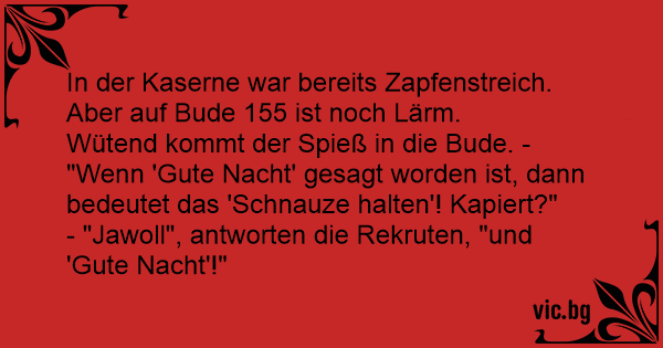 - "Jawoll", antworten die Rekruten, "und 'Gute Nacht'!"