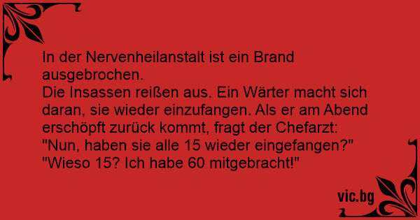 Пожар в лудницата. Лудите успяват да избягат и всички санитари тръгват да ги съберат и върнат. Вечерта главния психар събира пазачите и пита:
