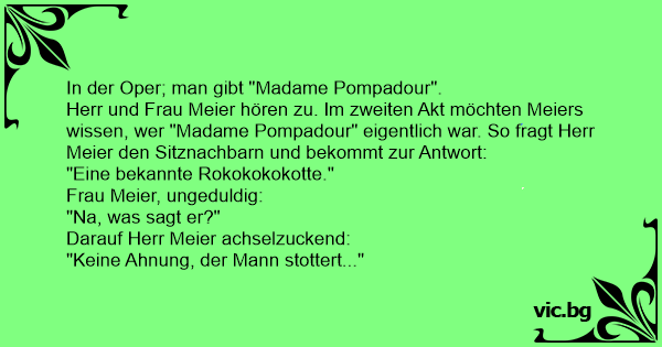 Herr und Frau Meier hören zu. Im zweiten Akt möchten Meiers wissen, wer "Madame Pompadour" eigentlich war. So fragt Herr Meier den Sitznachbarn und bekommt zur Antwort: