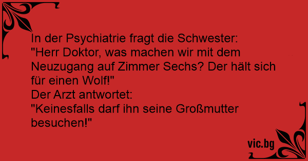 "Herr Doktor, was machen wir mit dem Neuzugang auf Zimmer Sechs? Der hält sich für einen Wolf!"