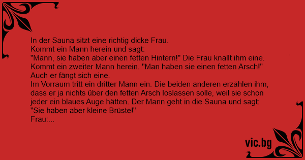 Ein Mann sitzt in der Sauna. Eine Frau kommt dazu. Er sieht, dass die Frau einen gewaltigen Hintern hat und macht durch ohau darauf aufmerksam. Sie knallt ihm einen. Er sagt nichts mehr. Sechs...